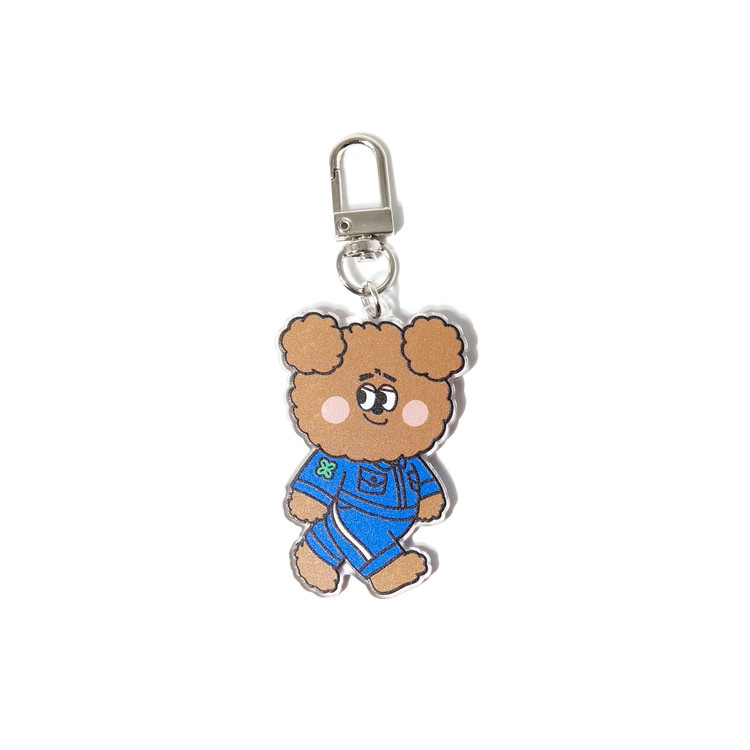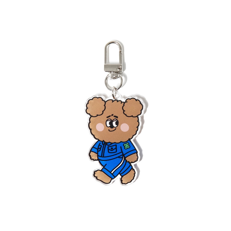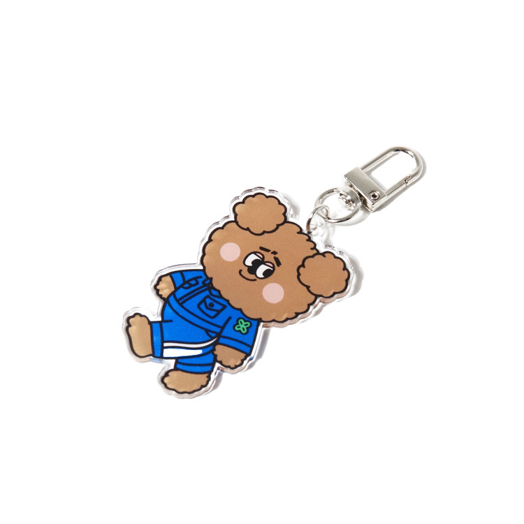 일상의 즐거움을 만드는 공장 쁘띠팩토리 유니폼을 착용한 캐릭터 아크릴 키링입니다.