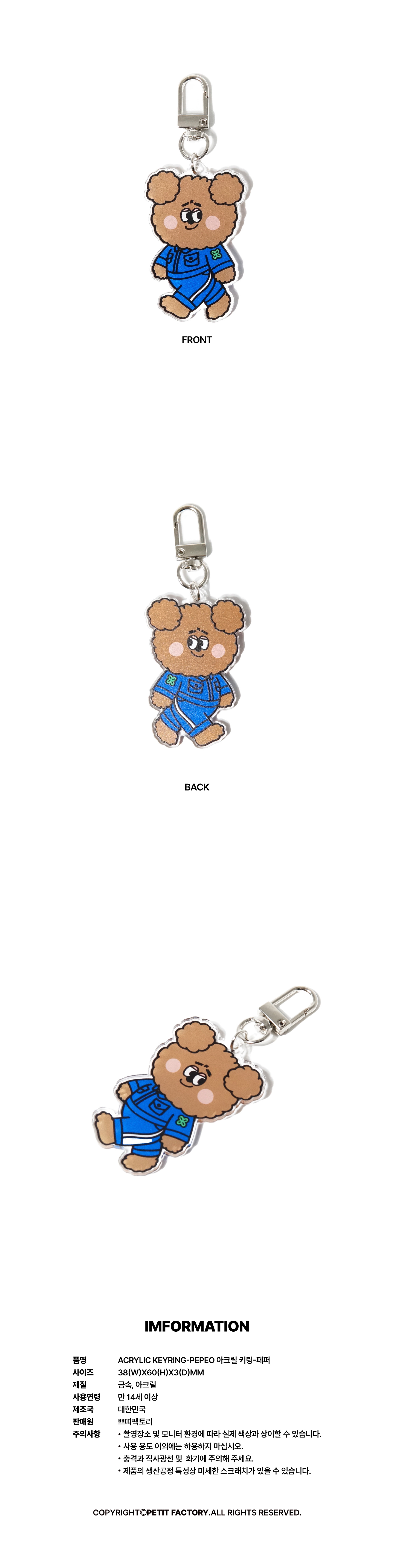 일상의 즐거움을 만드는 공장 쁘띠팩토리 유니폼을 착용한 캐릭터 아크릴 키링입니다.